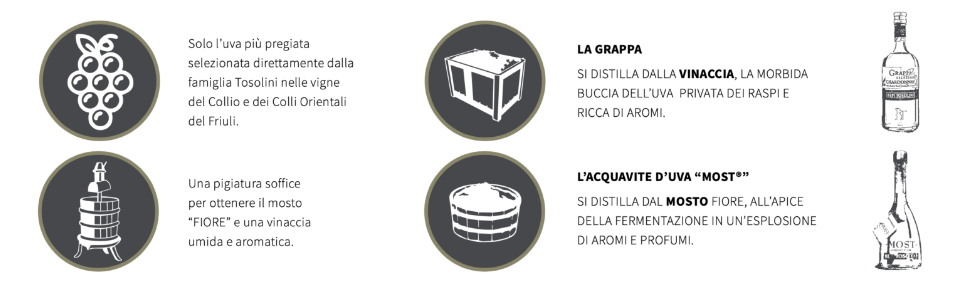 Materie prime selezionate con severità: sono la base irrinunciabile per ottenere distillati di eccellenza. Bepi Tosolini può contare su una rete fidata di fornitori sul territorio e sceglie con cura ed estrema attenzione le vinacce per le sue grappe che vengono distillate fresche a poche ore dalla loro follatura. Nessun metodo per la loro conservazione può superare il risultato della freschezza. La vinaccia fresca è il primo segreto della nostra ricetta; gli alambicchi tradizionali, la mano esperta dell’uomo e il rispetto dei giusti tempi della qualità sono gli ingredienti fondamentali che mettono la firma su specialità con una personalità unica.