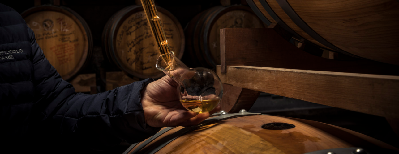 Nel rispetto della sua nuova idea di grappa di qualità, Bepi decide di produrre un distillato limpido e non più ambrato, come era uso fare all’epoca, effettuando l’affinamento in botti di frassino invece che nelle tradizionali botti di rovere. Il frassino consente di ottenere una grappa di colore bianco, limpida e trasparente, esaltando i profumi e le caratteristiche organolettiche del distillato.