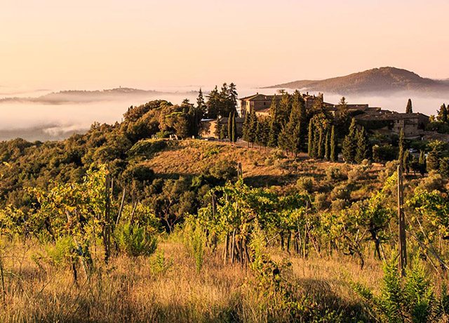 Un mare di boschi, di oliveti, di vigneti, punteggiato di borghi, di pievi, di castelli.